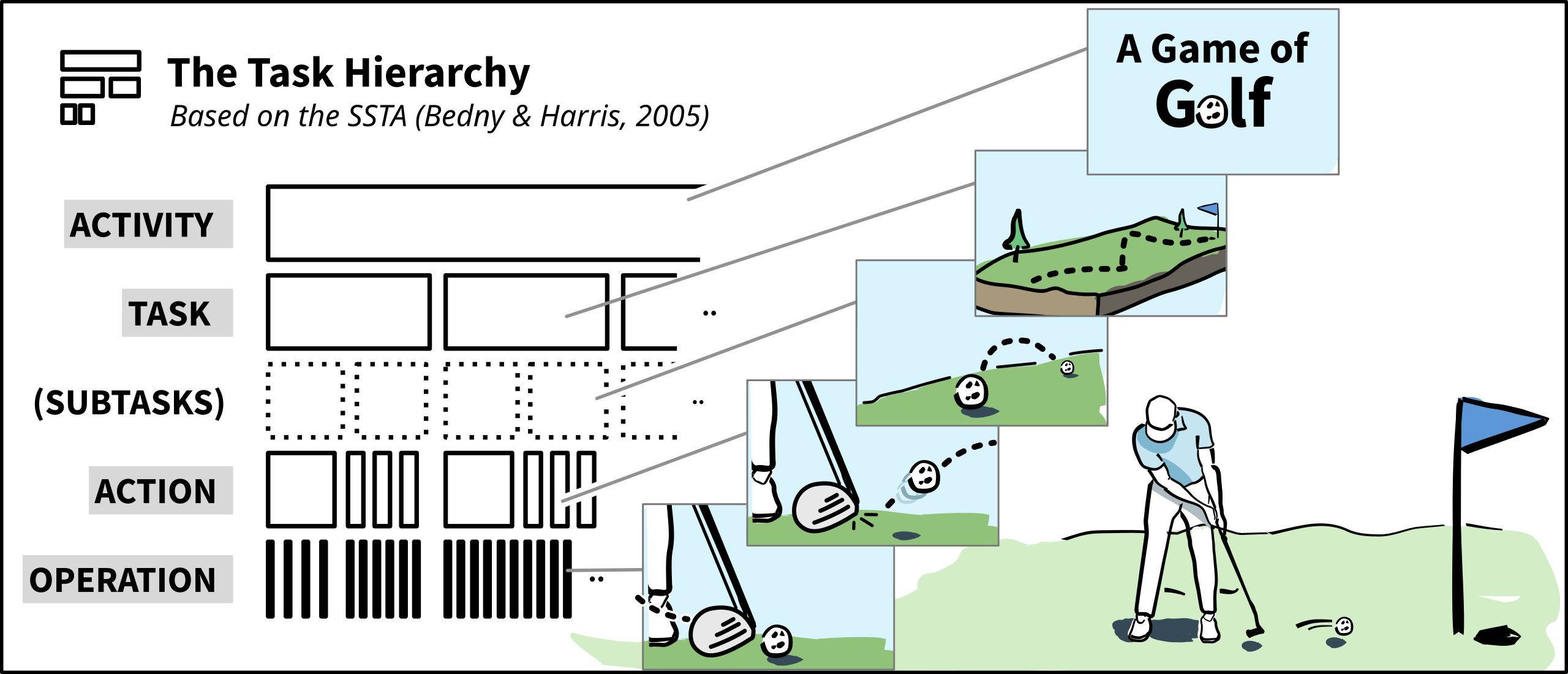 Aiming, Pointing, Steering bridges the Systemic-Structural Theory of Activity (SSTA) to goals and mechanics in game literature. To exemplify each level (activity, task, action, and operation), we examine an imagined digital golf game. The activity level describes playing one game of golf. The task level describes completing one single hole (an 18 hole golf game consists of 18 tasks). Sub-task levels describe the intermediary golf shots that the player chooses to take to solve the task. The action level describe the actions the player consciously takes to complete each golf shot - adjusting the direction, their knees, and making the swing (multiple swings if they miss the ball). The lowest operation level describes subconscious events performed by players within each action - for example the timing and tension of muscles during the swing itself. The figure above is licensed under a CC-BY 4.0 international license.